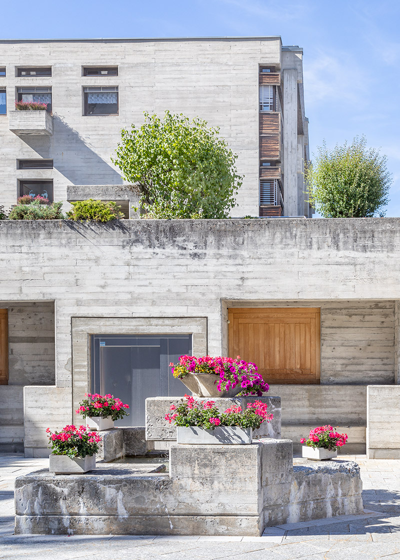 The ascent to the sacral icon begins rather secularly. The plinth structure on Rue Principale integrates a bar, village shop, post office counter and public toilet. Weather-beaten chalets line the narrow street. A flight of concrete stairs leads up to the central plateau. It is a barren and exposed square. In the middle, a fountain made of interlocking concrete blocks, complete with pink geranium arrangement, gurgles. The draughty esplanade also serves as a passage to the school, sports hall and municipal administration, also built in exposed concrete. Before entering the main, but slightly hidden entrance to the church, it is worth taking a little rest, because you are about to be blown away.