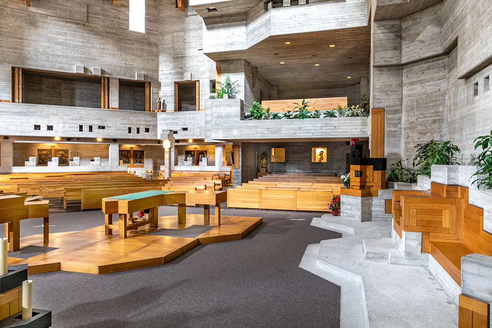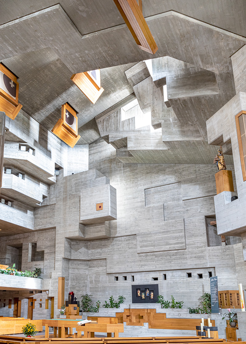 For the monumental interior is a revelation, even for the hard-boiled and faithless. The vast, grotto-like, hexagonal space could potentially fit in 1000 people. Expressionist concrete structures immediately enthrall the eyes. Indirect light that falls through strategically placed openings in the jagged ceiling, adds further thrills and chills. The liturgical elements are made of wood and live the open and inclusive spirit of Vatican II, held in 1962-1965. Along the walls and ceiling, wooden frames absorb the noise and house paintings from the old church. One cannot help but sink to one’s knees, such is the architectural force of the total work of art. No miracles were needed for Förderer’s masterpiece to be swiftly awarded national heritage status.
