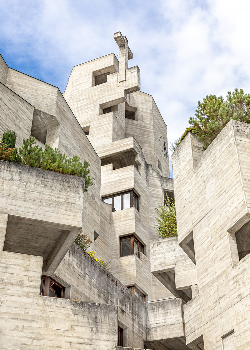 Saint Nicolas church in the Valais mountain village of Hérémence in the Eringer Valley is proof that concrete and mountains can go very well together indeed. Inaugurated on 31 October 1971, the 17-metre-high complex extends over several plateaus and, with its kinks, numerous openings, nooks and crannies, looks as if it has been hewn directly out of the steep slope. The concrete church is considered the undisputed Matterhorn of Swiss Brutalism.